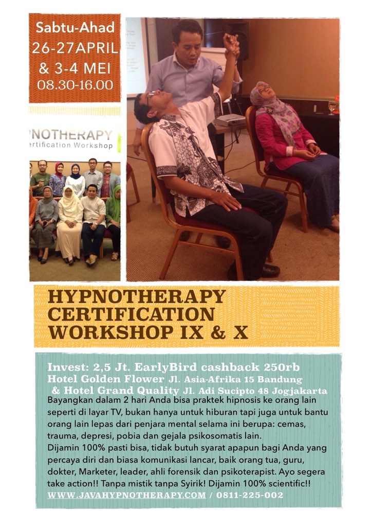 Bayangkan!! Hanya dalam 2 hari Anda bisa praktek hipnosis ke orang lain seperti di layar TV, bukan hanya untuk hiburan tapi juga untuk bantu orang lain lepas dari penjara mental selama ini berupa: cemas, trauma, depresi, pobia dan gejala psikosomatis lain.
