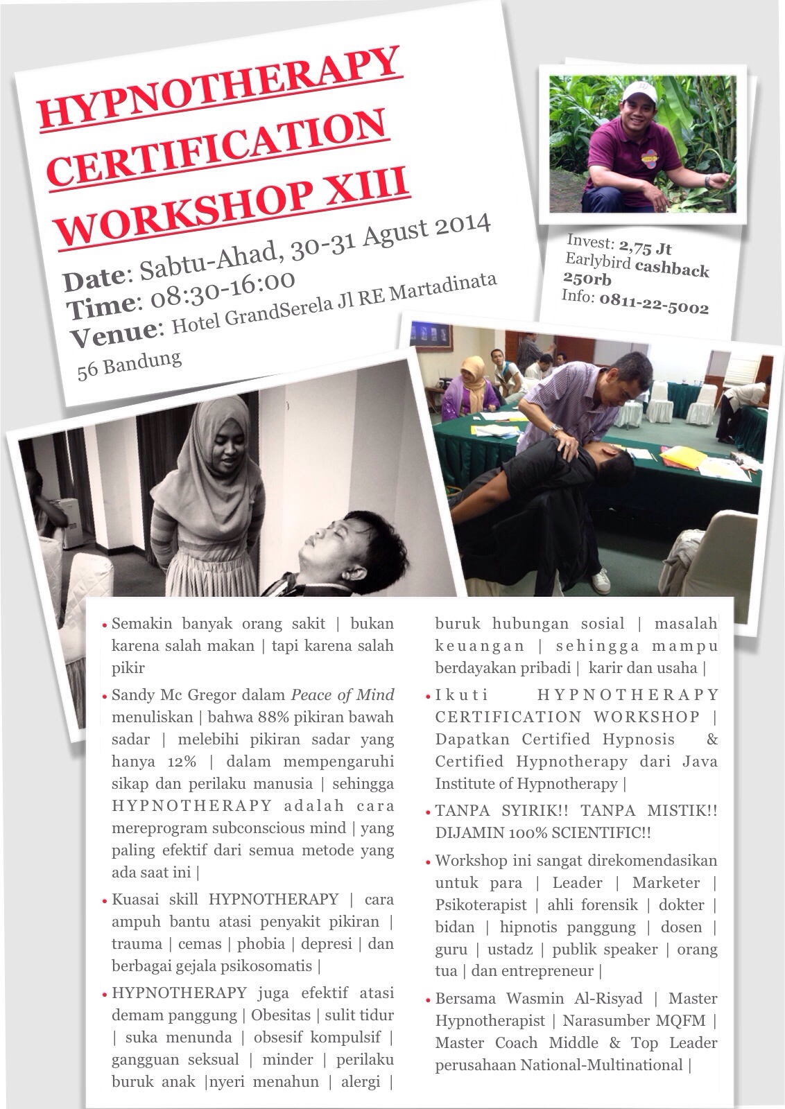 Ikuti HYPNOTHERAPY CERTIFICATION Workshop angkatan ke-13. Bersama BPK Wasmin Al Risyad. MasterCoach perusahaan nasional-Multinasional dan narasumber Mqfm.