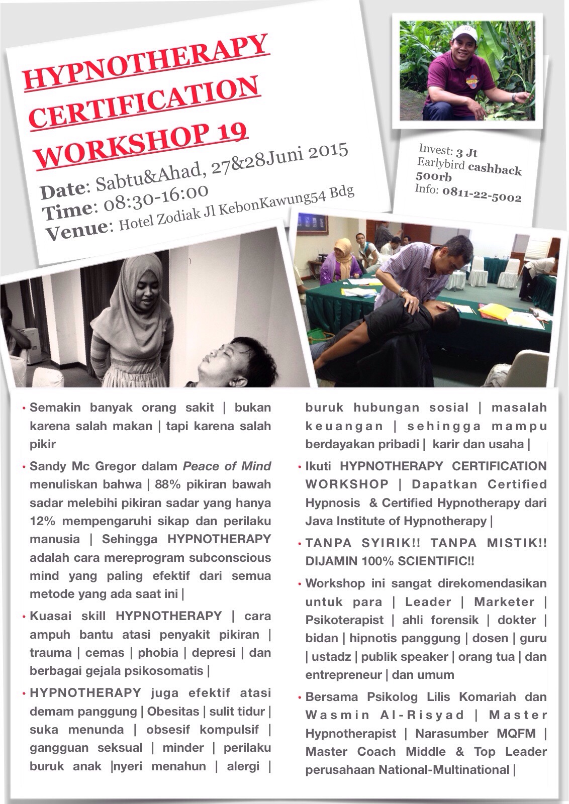 APA YG DULU TDK MASUK AKAL, BISA LANGSUNG ANDA PERCAYAI DN BUKTIKAN SENDIRI! Hanya dlm 2 hari Anda bisa praktek hipnosis ke orang lain seperti di layar TV, bkn hnya utk hiburan tapi juga utk bantu orang lain lepas dari penjara mental selama ini berupa: cemas, trauma, depresi, pobia dan gejala psikosomatis lain. Ikuti HYPNOTHERAPY CERTIFICATION Workshop Batch-18. Bersama Ibu Lilis Komariah Psikolog dn Bpk Wasmin Al Risyad MasterCoach perusahaan nasional-Multinasional dan Narasumber Mqfm. Ayo segera take action!! Tanpa mistik tanpa Syirik! Dijamin 100% scientific.