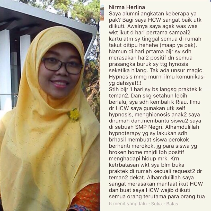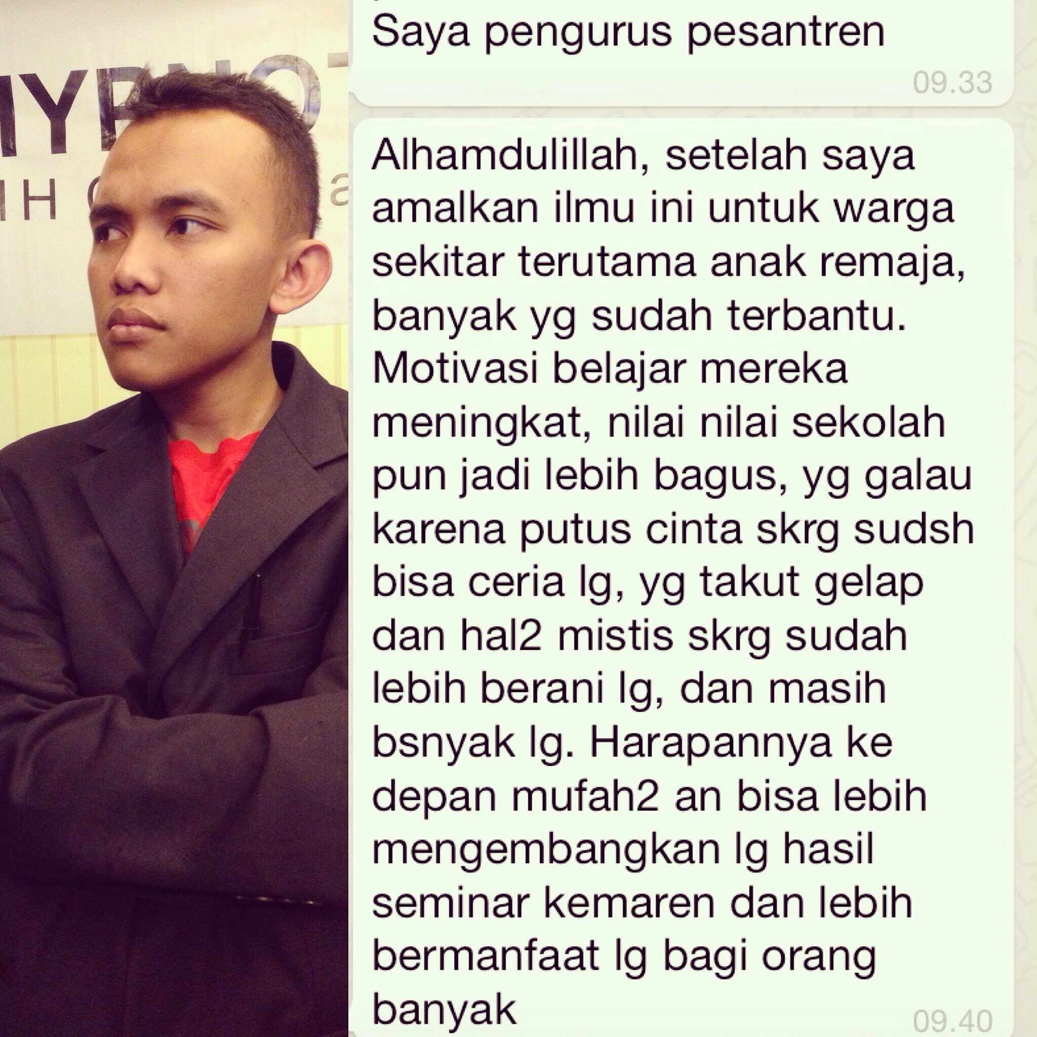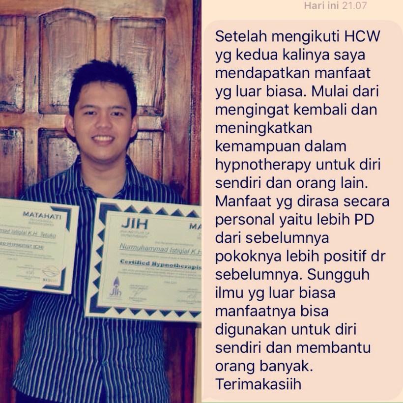 Bantu orglain lepas dari penjara mental penghambat datangnya rezeki, berupa pobia, trauma, stress, dn psikosomatis. Ikuti Hypnotherapy Certification Workshop batch 26. Investasi: 3Jt, earlybird cashback 500rb. Sabtu&Ahad 26&27Des. di Hotel Zodiak Jl Kebon kawung Bdg. Jam08.30-16.00 Pendaftaran via trf ke BNI Rek: 0223159604 a/n wasmin. Klo sdh trf konfirmasi nama lengkap peserta ya. Jz nuhun. Info lengkap: 0811225002. Trims