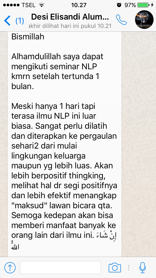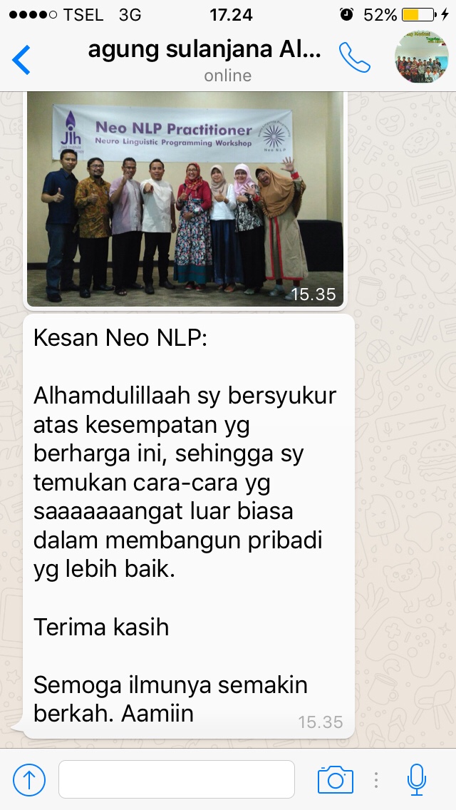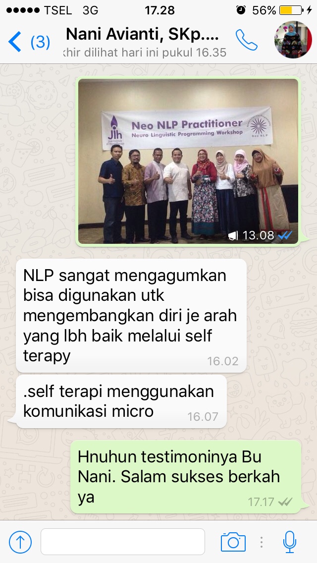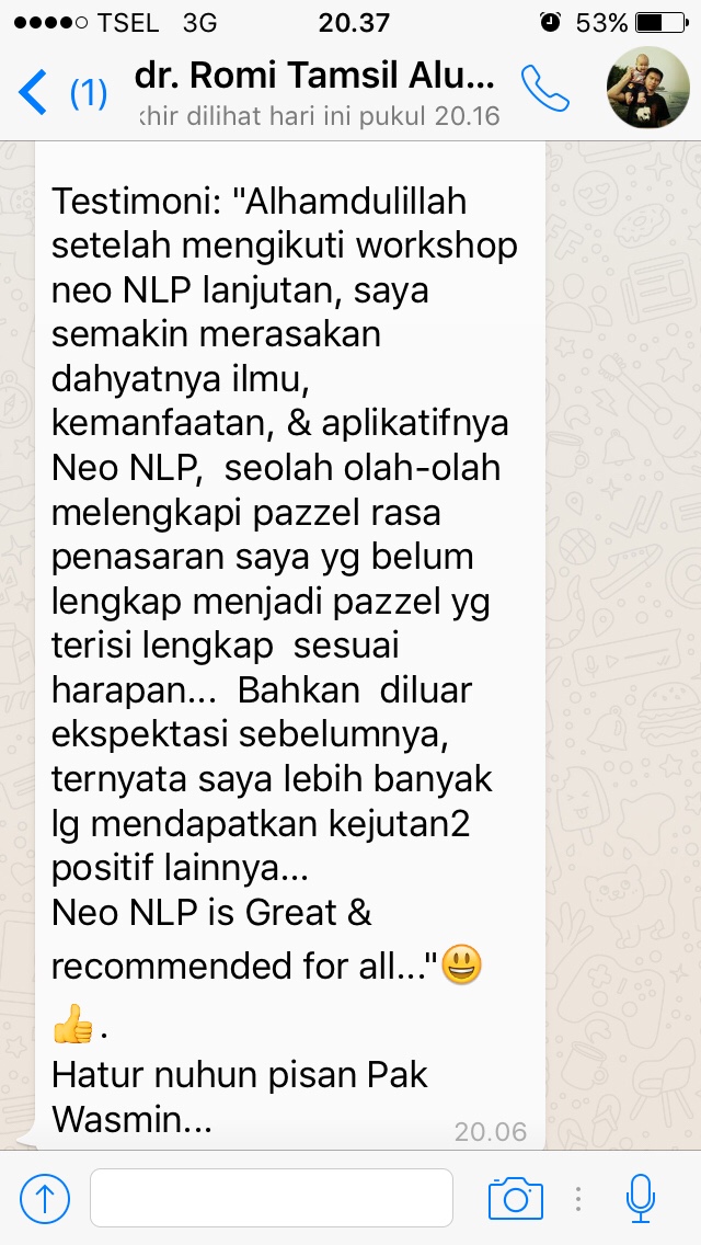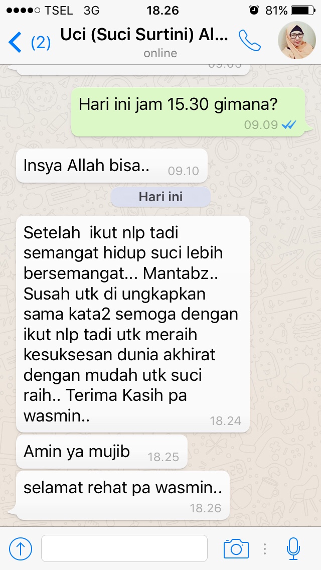 Assalamua’laikum. Alhamdulillah Pak Wasmin, setlah mengikuti Neo NLP saya jd mengerti prinsip komunikasi micro yg sdh Bapak jelaskan secara detail. Mudah2n ilmunya bisa saya aplikasikan dalam kebaikan di berbagai bidang, terutama perbaikan& pengembangan diri, keluarga, pekerjaan, kehidupan sosial bermasyarakat. Sehingga tercatat disisi Alloh sebagai ilmu yg bermanfaat…dan tentunya Smoga Pak Wasmin jg dapat royalti pahala dari semua murid/peserta pelatihan Neo NLP yg mengamalkan ilmunya dalam kebaikan… Aamiin.